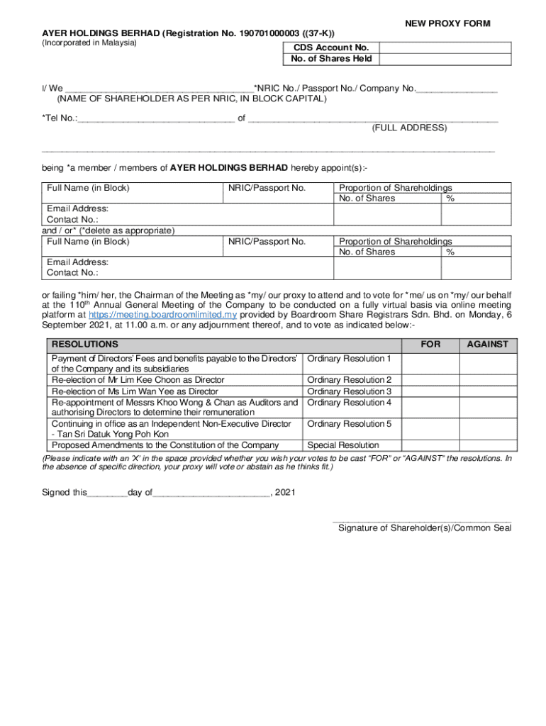 This document serves as a proxy appointment form for members of Ayer Holdings Berhad, allowing them to appoint proxies to attend and vote on their behalf at the company\'s 110th Annual General Meeting. The form includes sections for shareholder details, proxy information, and voting resolutions.