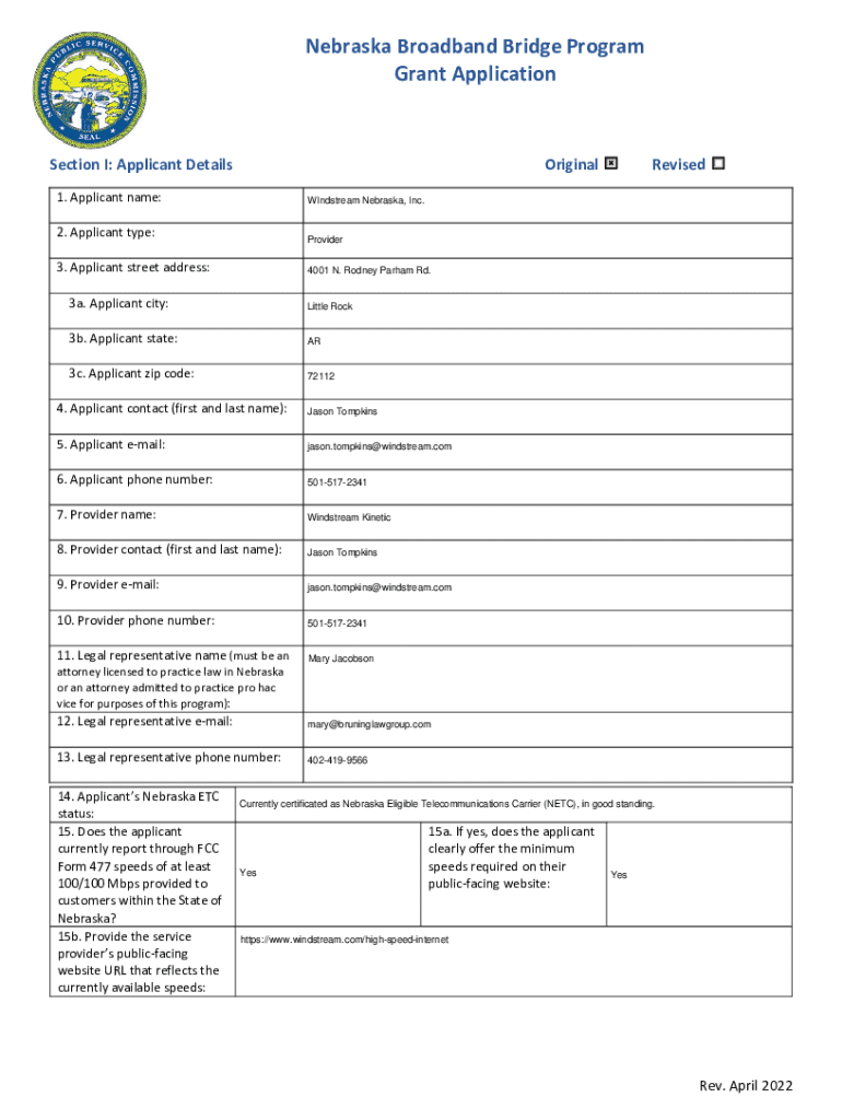 Nebraska Broadband Bridge Program Grant ApplicationSection I: Applicant DetailsOriginal 1. Applicant name:WIndstream Nebraska, Inc.2. Applicant type:Provider3. Applicant street address:4001 N. Rodney