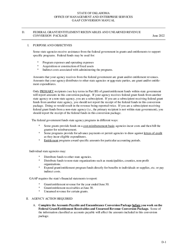 This manual provides guidance for state agencies in Oklahoma on reporting federal grant and entitlement revenues, receivables, and unearned revenue in accordance with GAAP. The document outlines the necessary actions for agencies to take, definitions of key terms, and the process for completing the conversion package accurately.