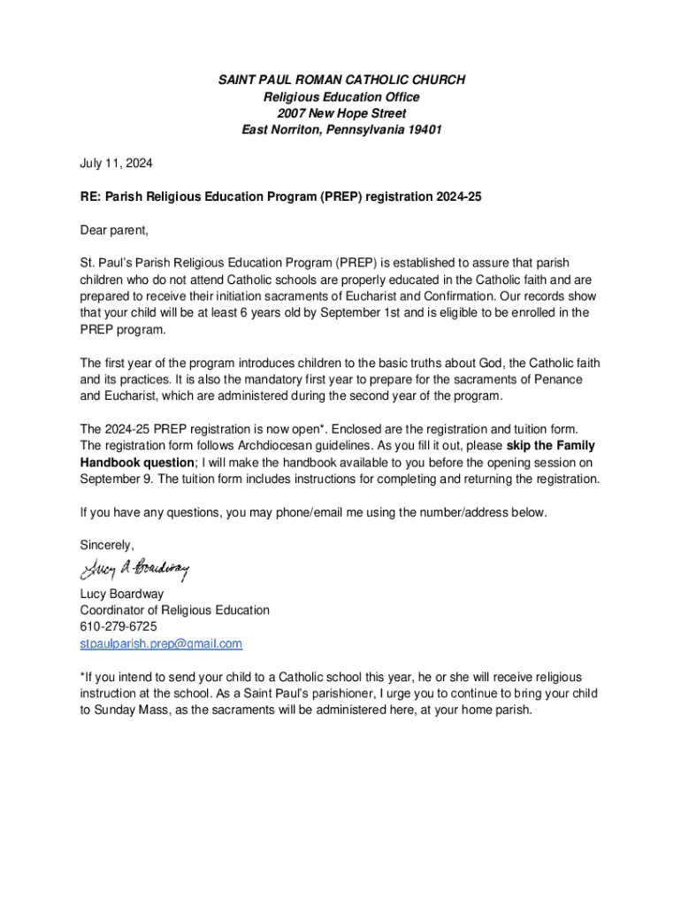 This document serves as a registration form for the Parish Religious Education Program (PREP) for the 2024-25 school year at Saint Paul Roman Catholic Church. It includes important information about the program, registration requirements, and contact details for the Religious Education Office. The program is aimed at educating parish children in the Catholic faith who do not attend Catholic schools, focusing on preparation for initiation sacraments such as Eucharist and Confirmation.