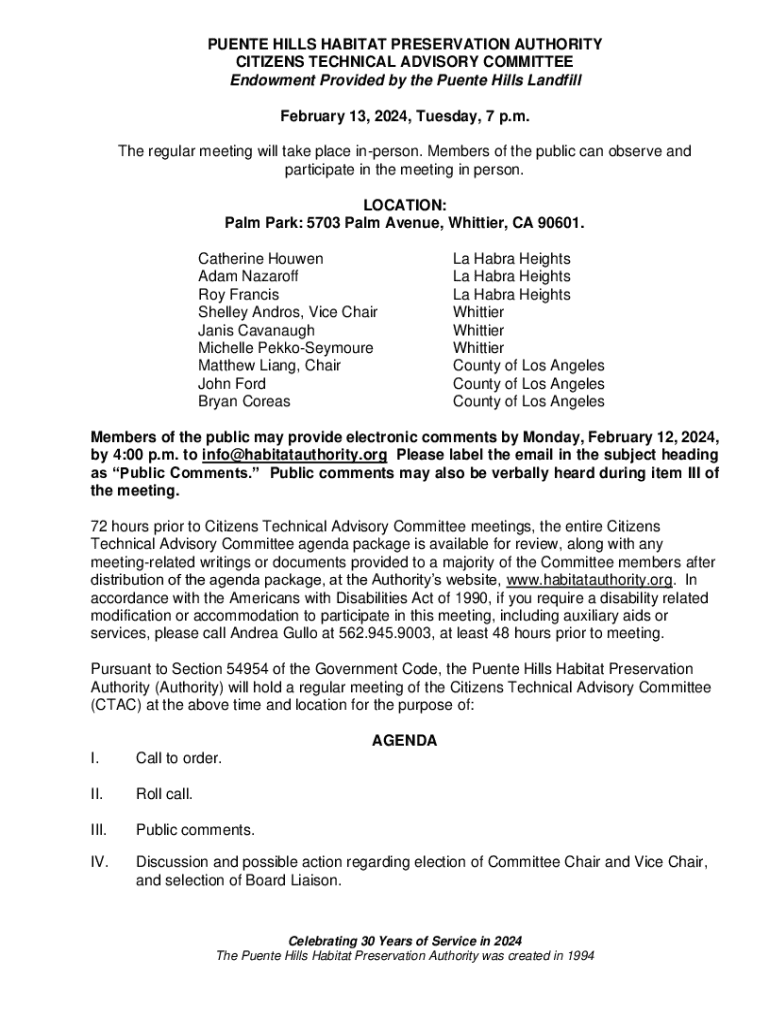 PUENTE HILLS HABITAT PRESERVATION AUTHORITY CITIZENS TECHNICAL ADVISORY COMMITTEE Endowment Provided by the Puente Hills Landfill February 13, 2024, Tuesday, 7 p.m. The regular meeting will take place