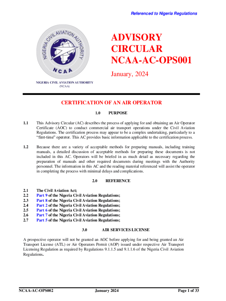 This Advisory Circular describes the process for applying and obtaining an Air Operator Certificate (AOC) to conduct commercial air transport operations in Nigeria. It provides essential details on the certification process, requirements, and steps necessary for both new operators and currently certificated operators seeking recertification. The AC outlines various phases of certification, documents required, and guidance for preparatory meetings with the Nigeria Civil Aviation Authority (NCAA).
