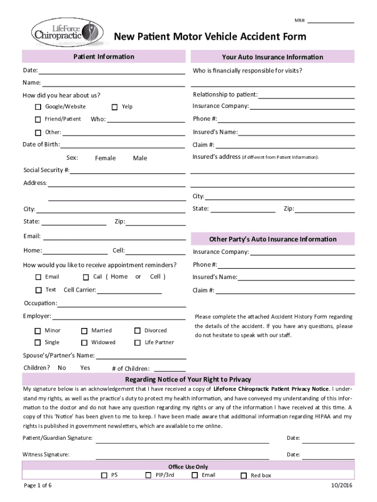 This document is a comprehensive intake form for new patients involved in a motor vehicle accident, gathering necessary patient, insurance, and accident-related information for chiropractic treatment.