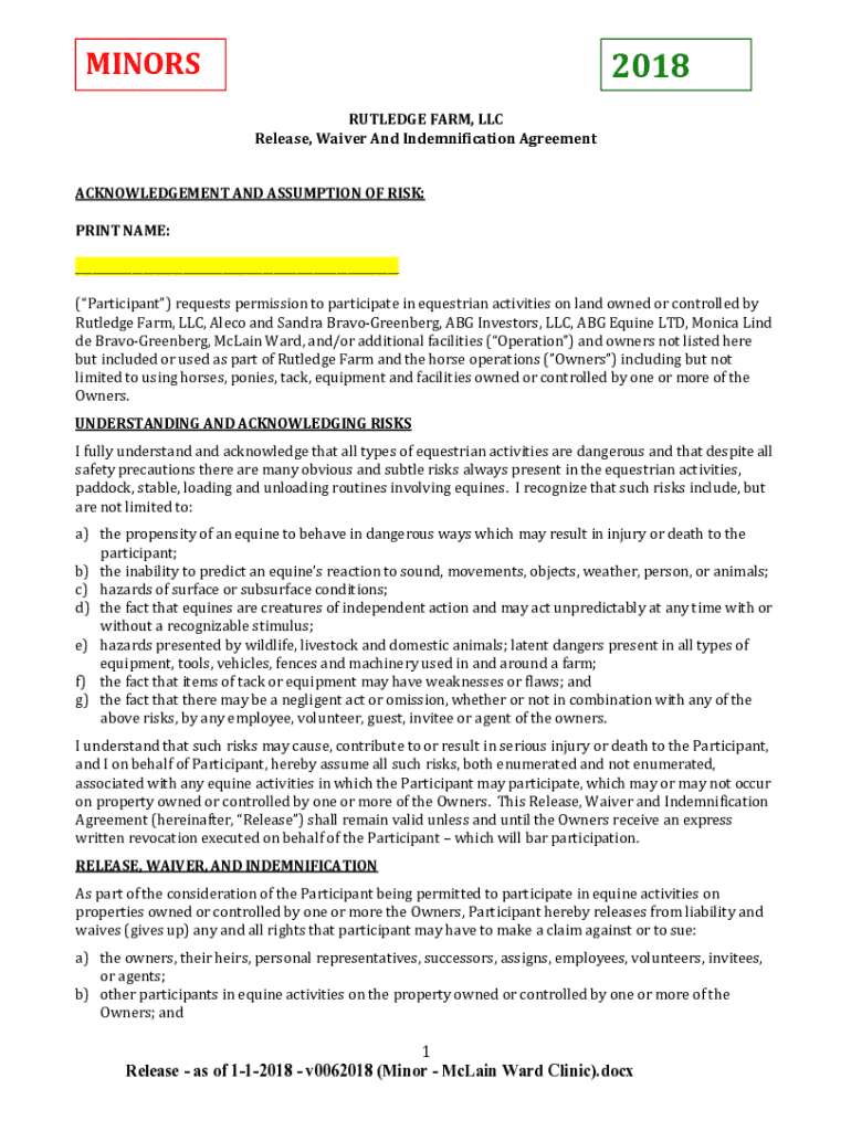 This document serves as a release, waiver, and indemnification agreement for participants engaging in equestrian activities at Rutledge Farm, LLC. It outlines the risks associated with these activities, the assumption of those risks by the participant, and the legal protections afforded to the farm owners. It also includes provisions regarding health care authorization and photo release.