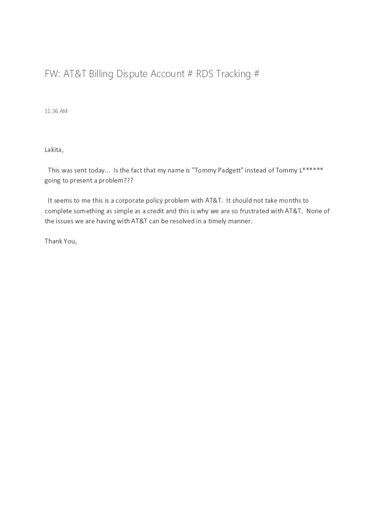 This document contains correspondence regarding a billing dispute between the customer, Tommy Padgett, and AT&T. It discusses issues related to billing discrepancies, account management problems, and frustrations experienced by the customer due to delays and miscommunication in resolving their complaints.