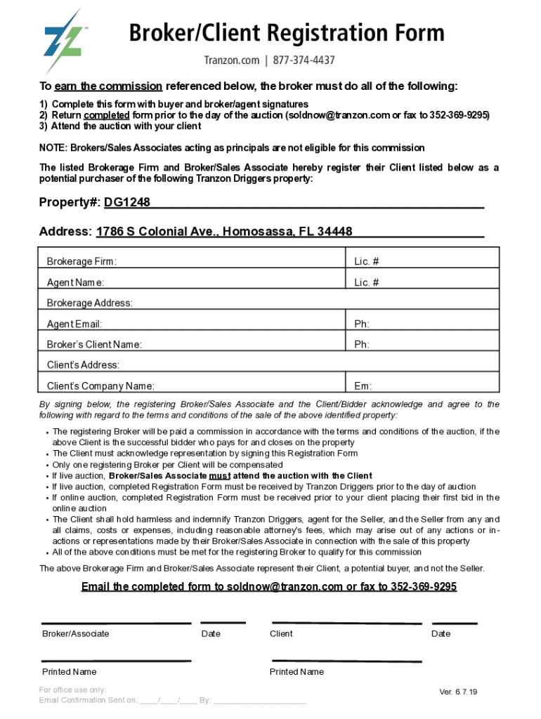 Broker/Client Registration Form Tranzon.com | 8773744437 To earn the commission referenced below, the broker must do all of the following: 1) Complete this form with buyer and broker/agent signatures