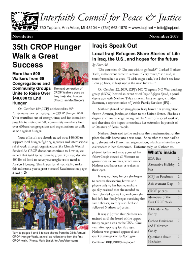 This newsletter highlights the accomplishments and activities of the Interfaith Council for Peace & Justice (ICPJ) for November 2009. It covers the success of the 35th CROP Hunger Walk raising over $40,000 for hunger relief, shares personal stories from Iraqi refugees, discusses efforts to address the achievement gap in education, and promotes upcoming events including an alternative holiday fair and a film screening.