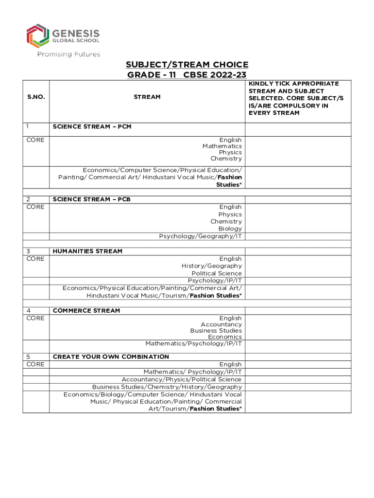 Get the free Subject Stream Choice Form