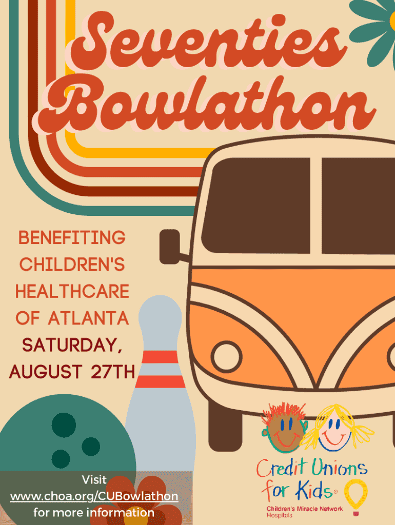 Seventies Bowlathon Benefiting Children\'s Healthcare of Atlanta Saturday, August 27thVisit www.choa.org/CUBowlathon for more informationSponsorship Information Credit Unions for Kids BowlaThon Bowlmor