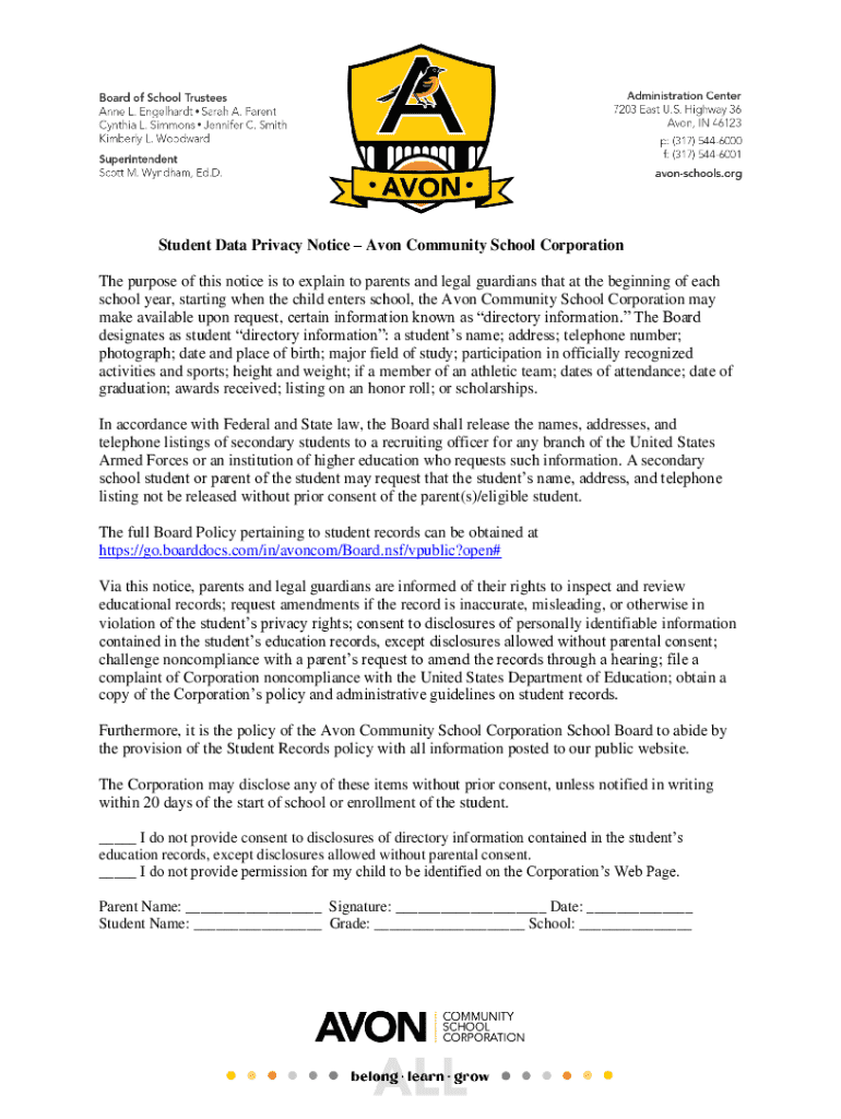 Get the free Student Data Privacy NoticeAvon Community School ...