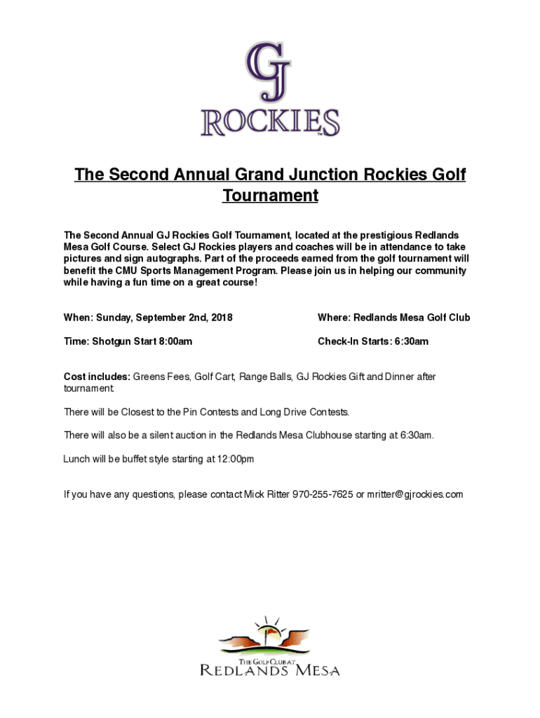 The Second Annual Grand Junction Rockies Golf Tournament The Second Annual GJ Rockies Golf Tournament, located at the prestigious Redlands Mesa Golf Course. Select GJ Rockies players and coaches will