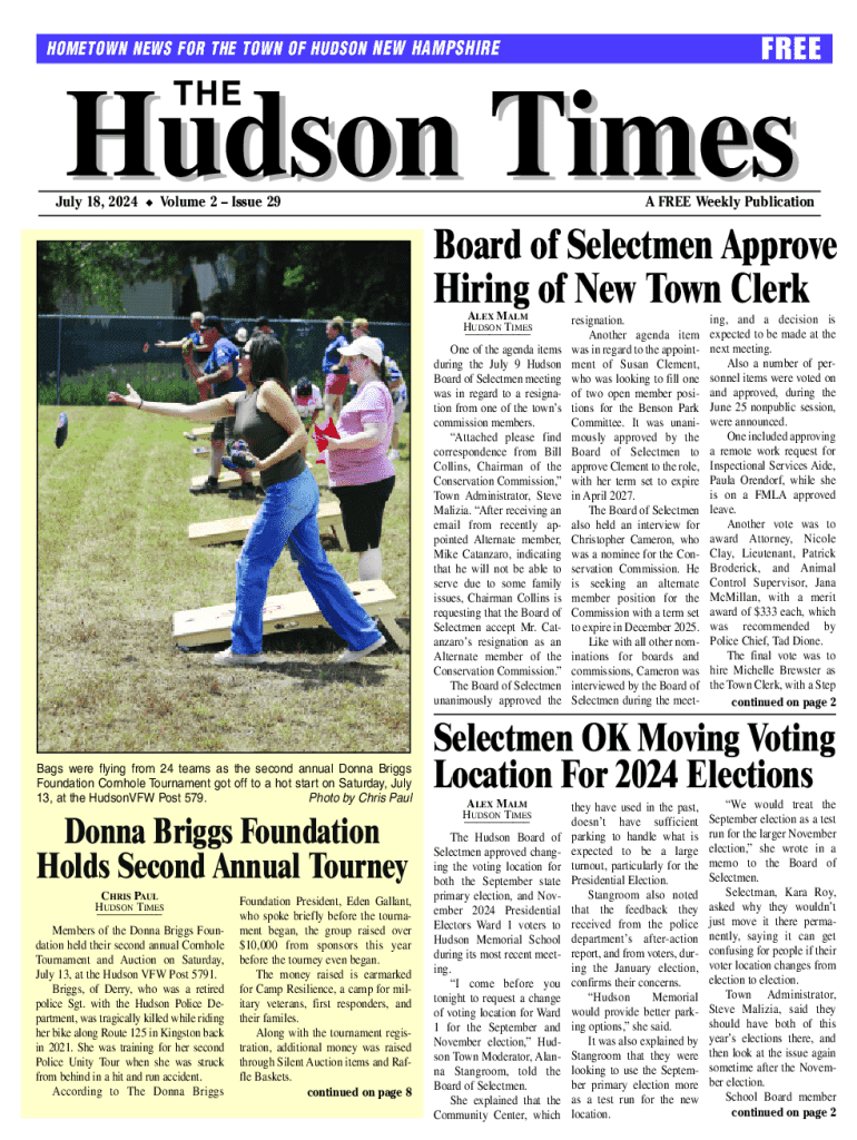 The Hudson Times is a weekly publication covering local news, events, and community updates for Hudson, New Hampshire. This issue features news from town meetings, local events, obituaries, and sports updates.