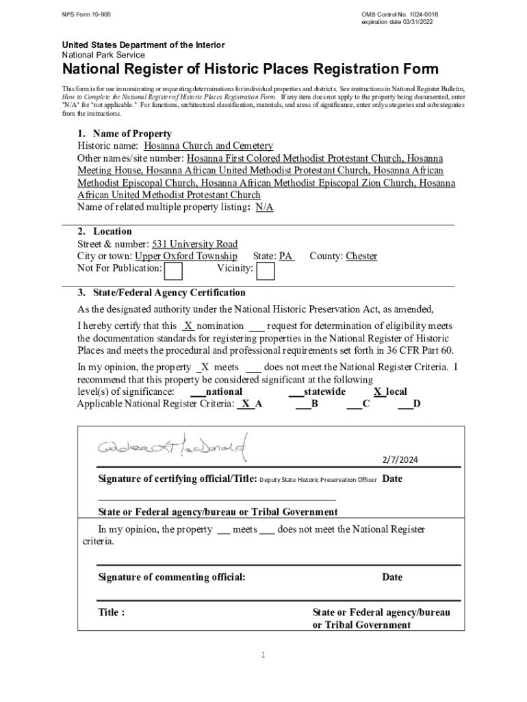 This document serves as a registration form for the nomination of the Hosanna Church and Cemetery, significant for its role in the history of the Hinsonville free black community and its association with Lincoln University. The form includes details about the property\'s location, ownership, architectural description, historical significance, and contributes to the recognition of the church\'s heritage.