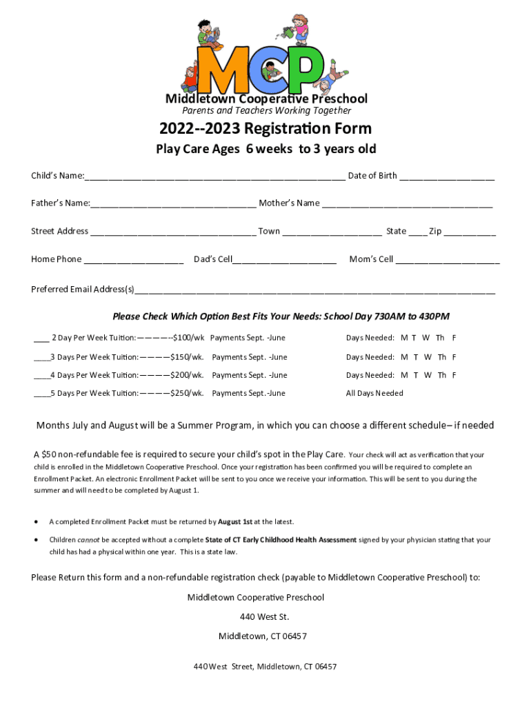 This document is a registration form for the Middletown Cooperative Preschool\'s Play Care program, detailing the personal information required, tuition options, enrollment procedures, and health assessment requirements for children ages 6 weeks to 3 years old.