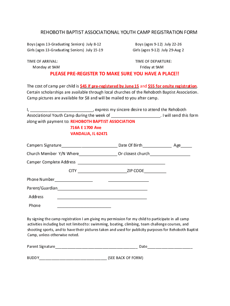 This document serves as a registration form for the Rehoboth Baptist Associational Youth Camp, outlining the necessary details for boys and girls aged 9-12 and 13-Graduating Seniors, including camp dates, registration fees, schedule, rules, and requirements for participation.
