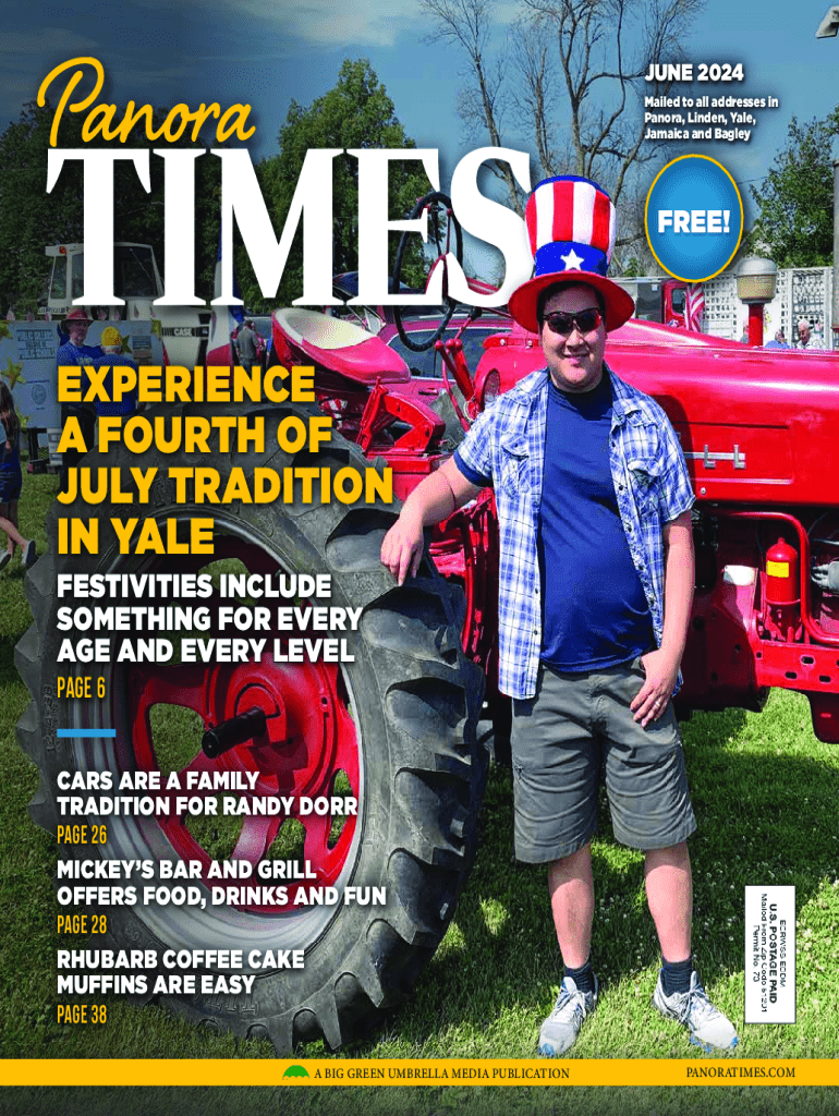The June 2024 edition of Panora Times features community news, event highlights including the Yale Fourth of July celebration, local business spotlights, film reviews, obituaries, and features on local residents and activities. It serves as a comprehensive resource for residents in Panora, Linden, Yale, Jamaica, and Bagley with updates on local happenings and services.