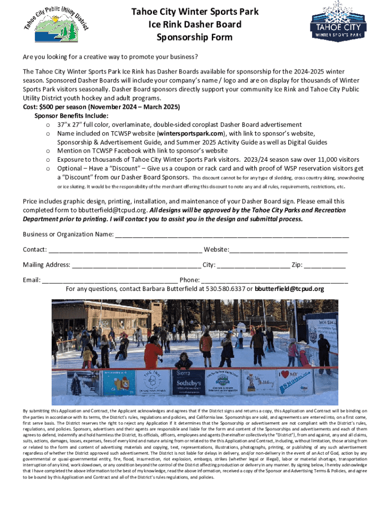 Tahoe City Winter Sports Park Ice Rink Dasher Board Sponsorship Form Are you looking for a creative way to promote your business? The Tahoe City Winter Sports Park Ice Rink has Dasher Boards available