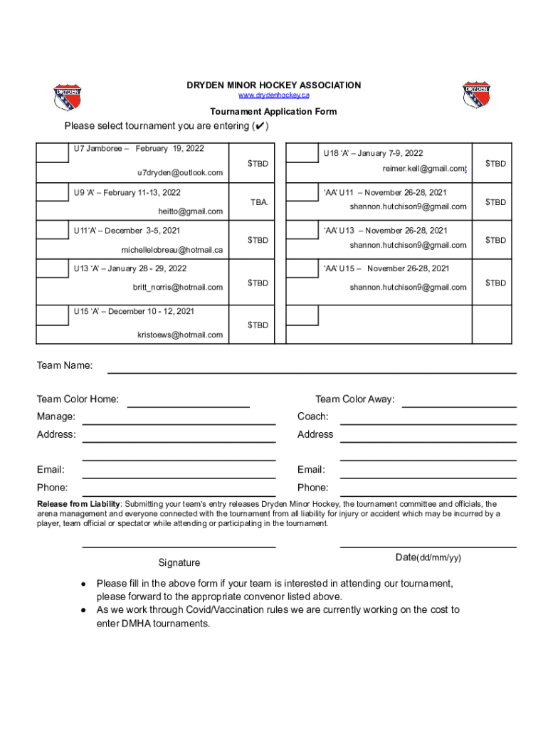 DRYDEN MINOR HOCKEY ASSOCIATION www.drydenhockey.caTournament Application FormPlease select tournament you are entering () U7 Jamboree February 19, 2022 u7dryden@outlook.comU18 A January 79, 2022