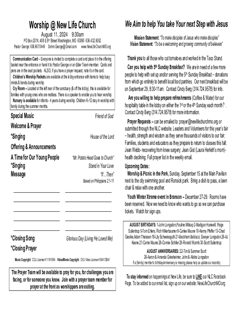 Worship @ New Life Church August 11, 20249:30amPO Box 2074, 408 E 8th Street Washington, MO 63090 636.432.5052 Pastor George: 636.667.0449 Dohm.George@Gmail.com www.NewLifeChurchMO.org Communication