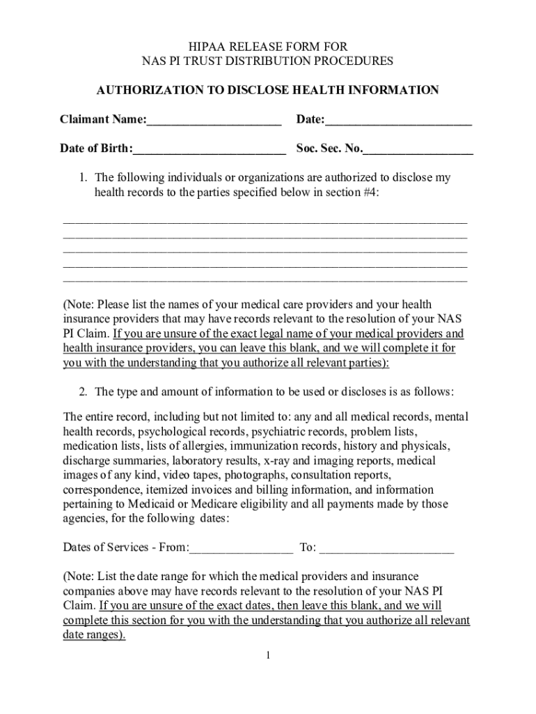 This document authorizes the disclosure of health information relevant to the NAS PI Claim for the claimant. It outlines the details of the information to be disclosed, the parties involved, and the rights related to revocation of the authorization. The form includes sections for specifying medical providers, types of information requested, and the expiration of the authorization.