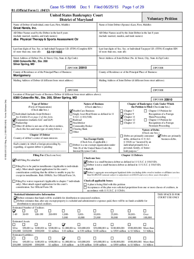 This document is a Voluntary Petition filed by Great Hands, Inc. in the United States Bankruptcy Court for the District of Maryland, indicating the debtor\'s intent to seek relief under Chapter 11 of the Bankruptcy Code. The filing includes information about the debtor\'s financial status, total assets, liabilities, creditors, and business operations.