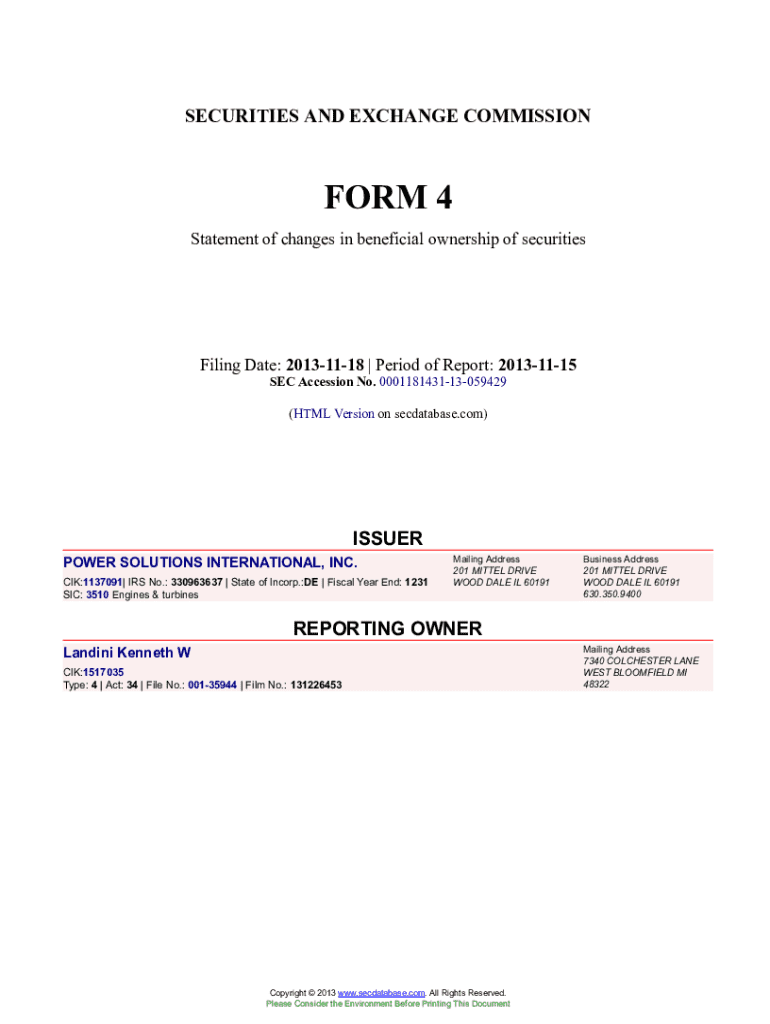 This document is a filing by a reporting person, Kenneth W. Landini, detailing changes in the beneficial ownership of securities for Power Solutions International, Inc. as required by Section 16(a) of the Securities Exchange Act of 1934.