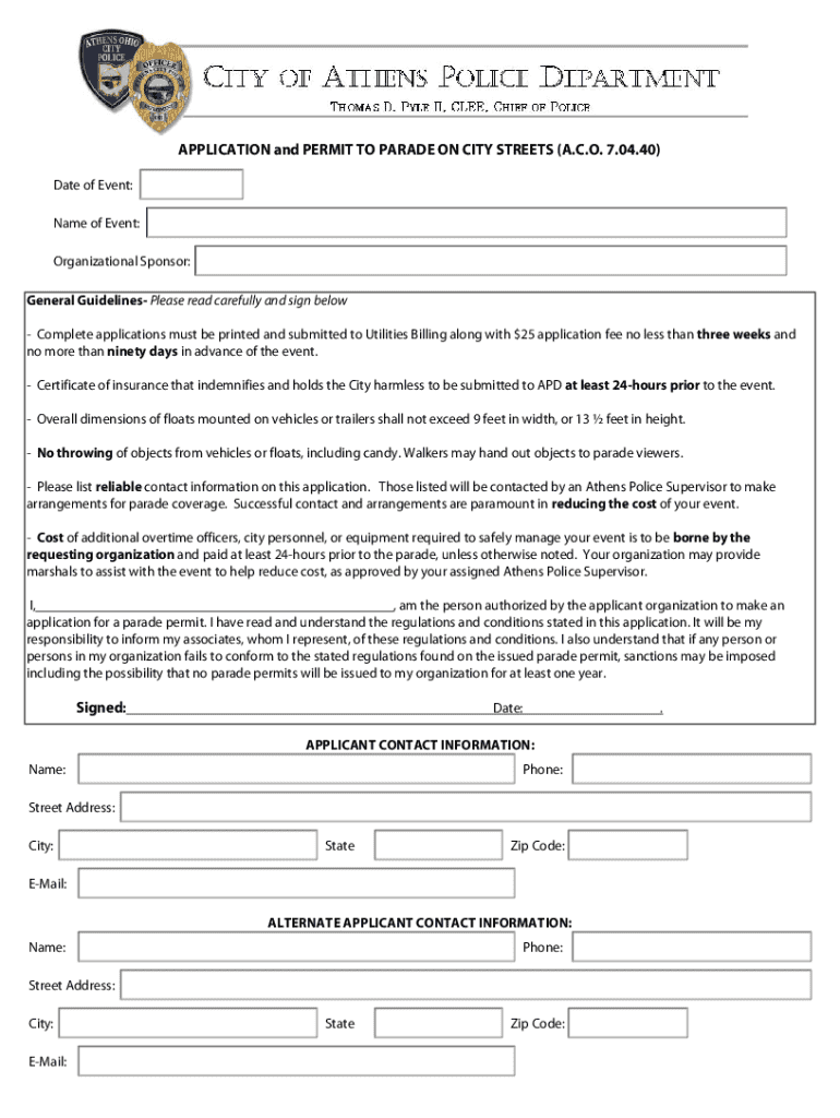 This document serves as an application and permit request for organizing a parade on city streets. It outlines necessary guidelines, fees, insurance requirements, and contact information for event organizers. The application must be submitted within specified timelines, and it includes conditions that must be adhered to for the permit to remain valid.