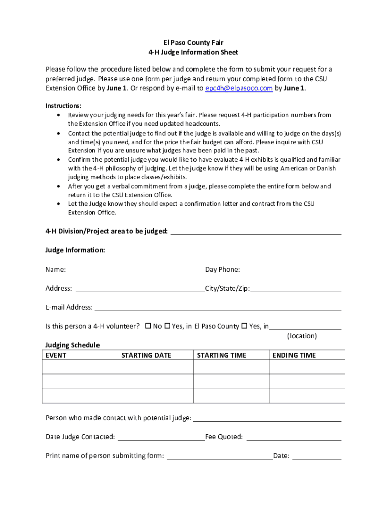 This document provides the procedure for submitting a request for a preferred judge for the El Paso County Fair\'s 4-H program. It outlines the steps to ensure that the judges are qualified, available, and familiar with 4-H judging methods. It includes information on how to contact the CSU Extension Office, deadlines for submission, and the necessary details required for the judge\'s information.