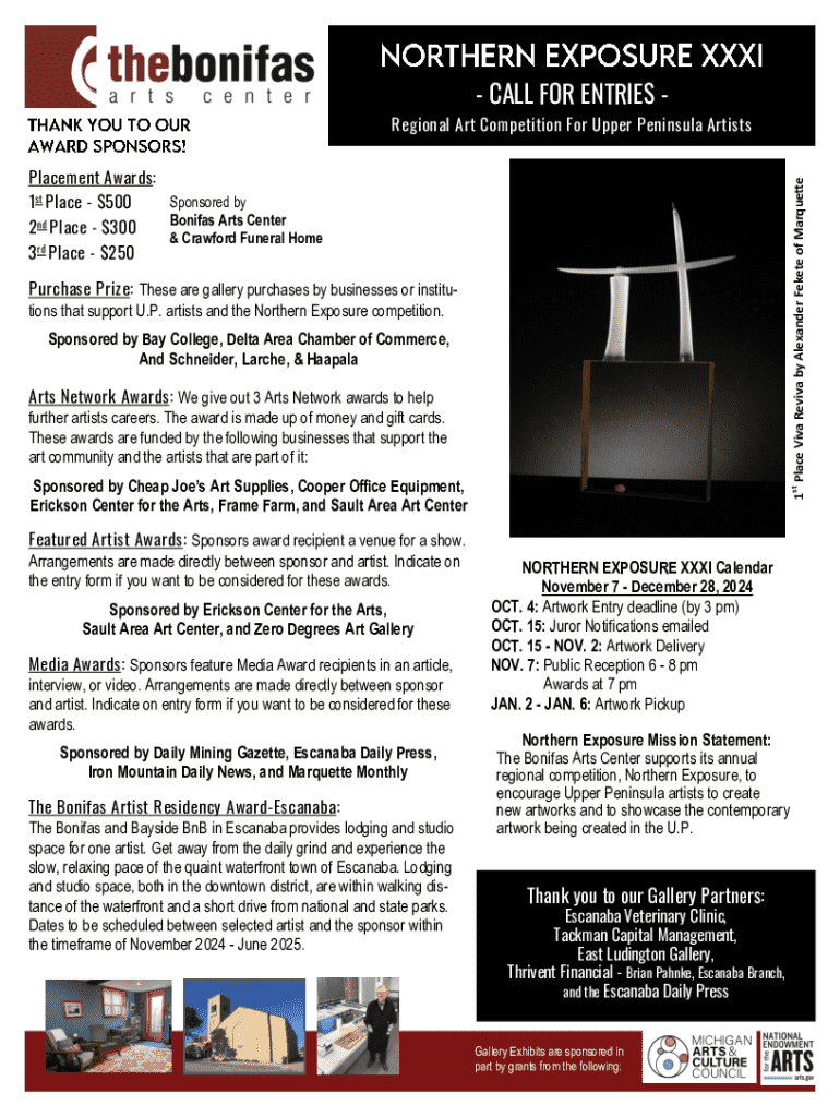 This document details the entry procedure for the Northern Exposure XXXI art competition, which invites artists from Michigan\'s Upper Peninsula to submit their original artwork for consideration. It includes information about awards, eligibility, entry requirements, deadlines, and guidelines for submission and display.