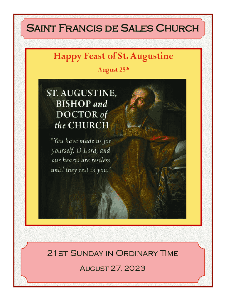Saint Francis de Sales Church Happy Feast of St. Augustine August 28th21st Sunday in Ordinary Time August 27, 2023ST. FRANCIS DE SALES CHURCH 13360 Valleyheart Drive South, Sherman Oaks, CA 91423