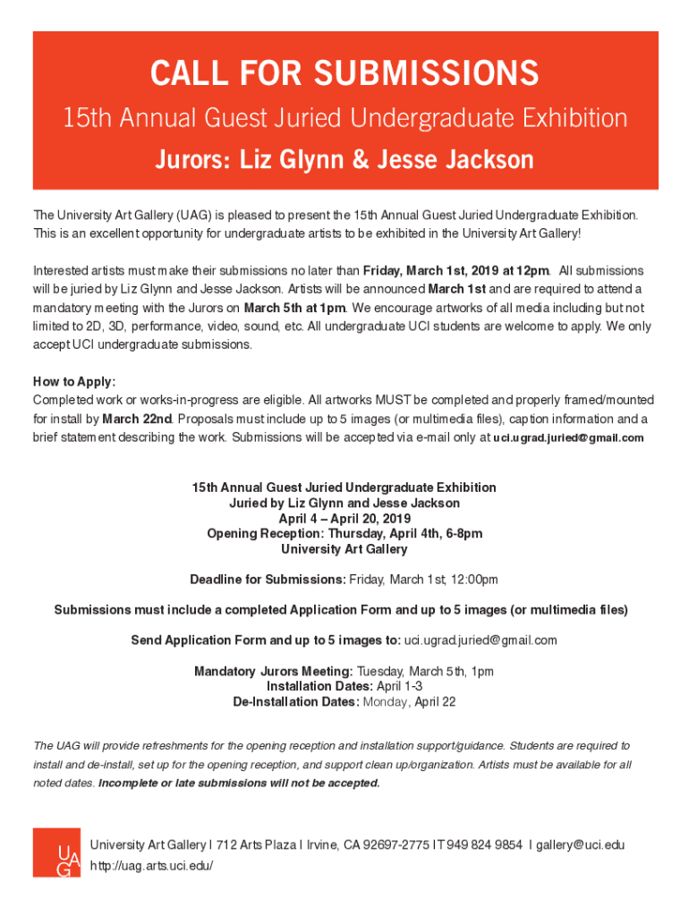CALL FOR SUBMISSIONS 15th Annual Guest Juried Undergraduate Exhibition Jurors: Liz Glynn & Jesse Jackson The University Art Gallery (UAG) is pleased to present the 15th Annual Guest Juried Undergraduate