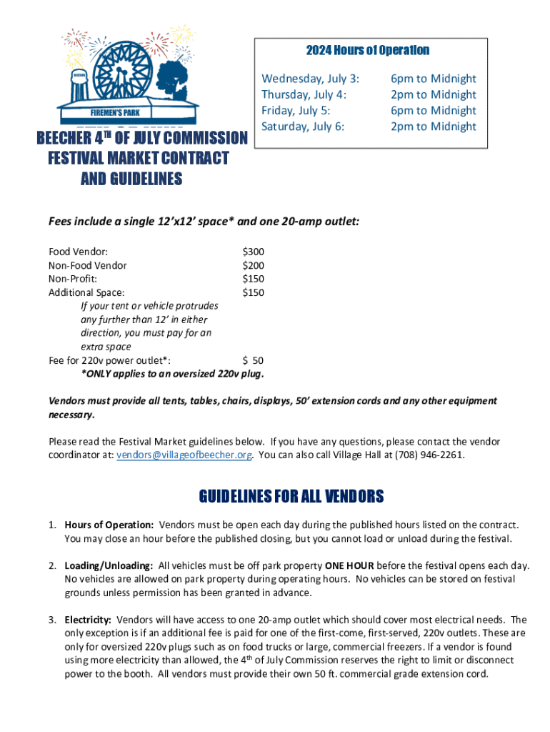 This document outlines the hours of operation, fees, guidelines, and requirements for vendors participating in the Beecher 4th of July Festival Market. It includes information on how to apply, necessary permits, and specific rules related to food vendors, merchandise, and vendor responsibilities during the festival.