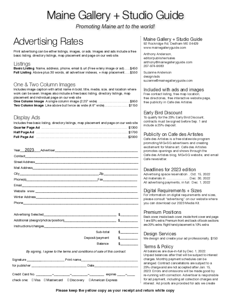Maine Gallery + Studio Guide Promoting Maine art to the world!Advertising RatesMaine Gallery + Studio GuidePrint advertising can be either listings, images, or ads. Images and ads include a free basic