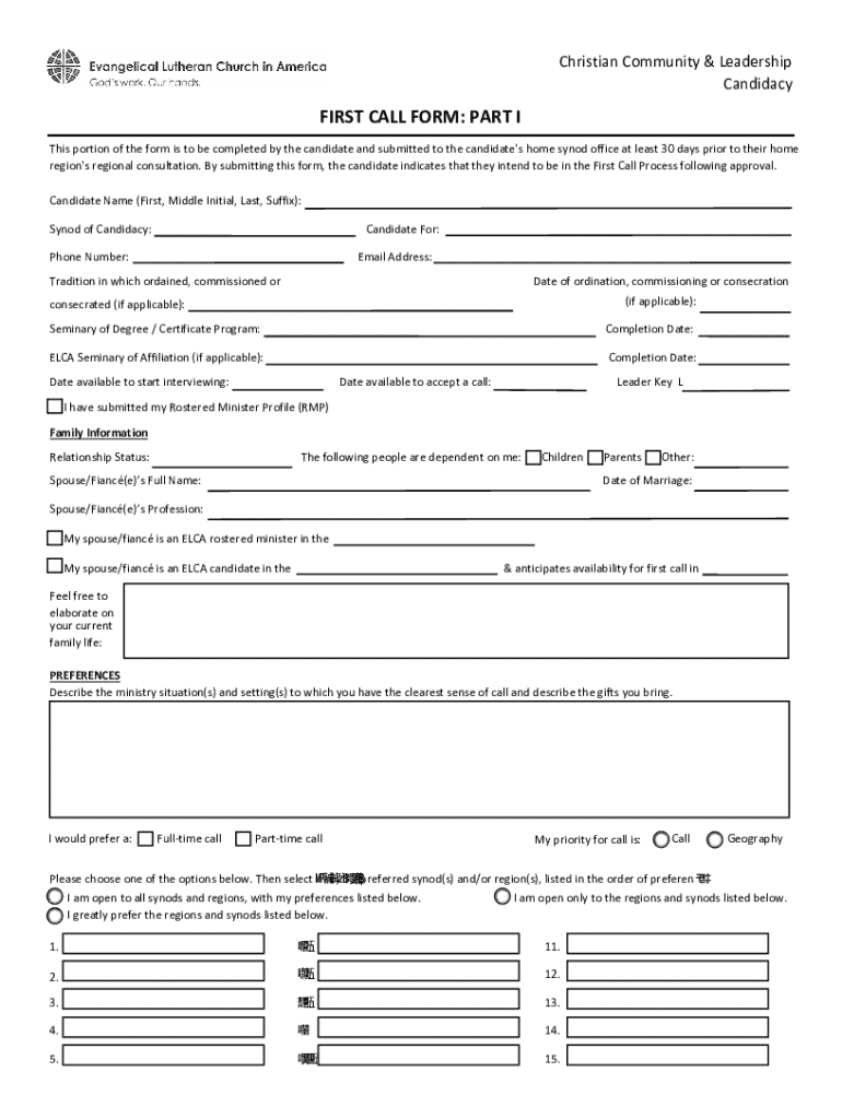 This fillable PDF form is designed for candidates in the First Call Process, detailing instructions on filling out the form and the necessary sections for candidates and synod leaders. It includes personal information, preferences for ministry settings, and details about the candidate\'s family situation. The form is structured in three parts, with specific sections to be completed by the candidate, synod bishop or staff, and the Candidacy and Leadership Manager.