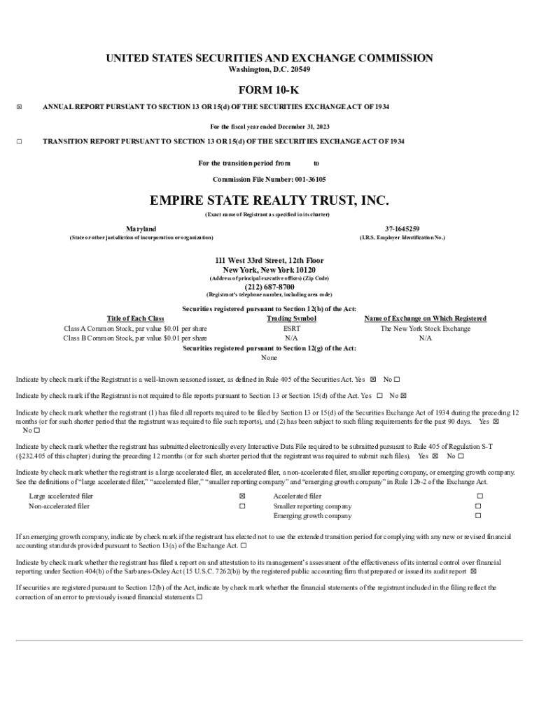 UNITED STATES SECURITIES AND EXCHANGE COMMISSION Washington, D.C. 20549FORM 10K ANNUAL REPORT PURSUANT TO SECTION 13 OR 15(d) OF THE SECURITIES EXCHANGE ACT OF 1934 For the fiscal year ended December 31, 2023TRANSITION REPORT PURSUANT TO SECTION 13 OR 15(d) OF THE SECURITIES EXCHANGE ACT OF 1934 For the transition period fromtoCommission File Number: 00136105EMPIRE STATE REALTY TRUST, INC. (Exact name of Registrant as specified in its charter)Maryland371645259(State or