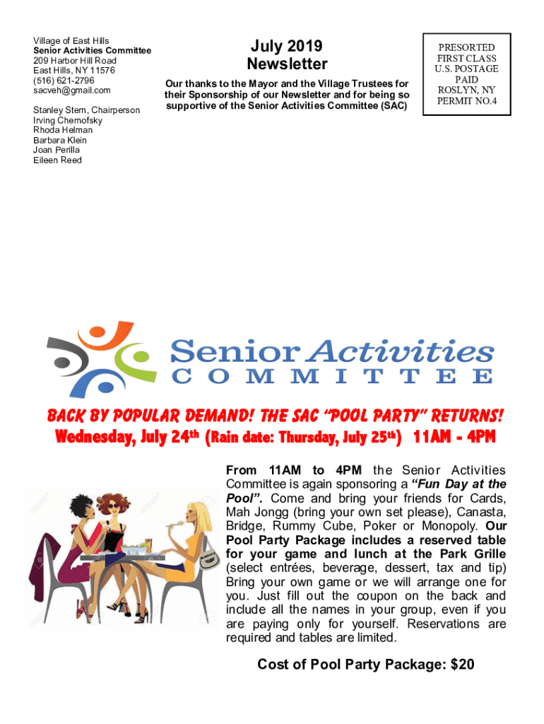 This newsletter outlines the upcoming events and activities organized by the Senior Activities Committee of the Village of East Hills for the month of July 2019. It includes details about the Pool Party, Water Exercise Classes, a trip to the New York Transit Museum, various cultural trips, and a special recognition of Eileen Reed for her outstanding service.