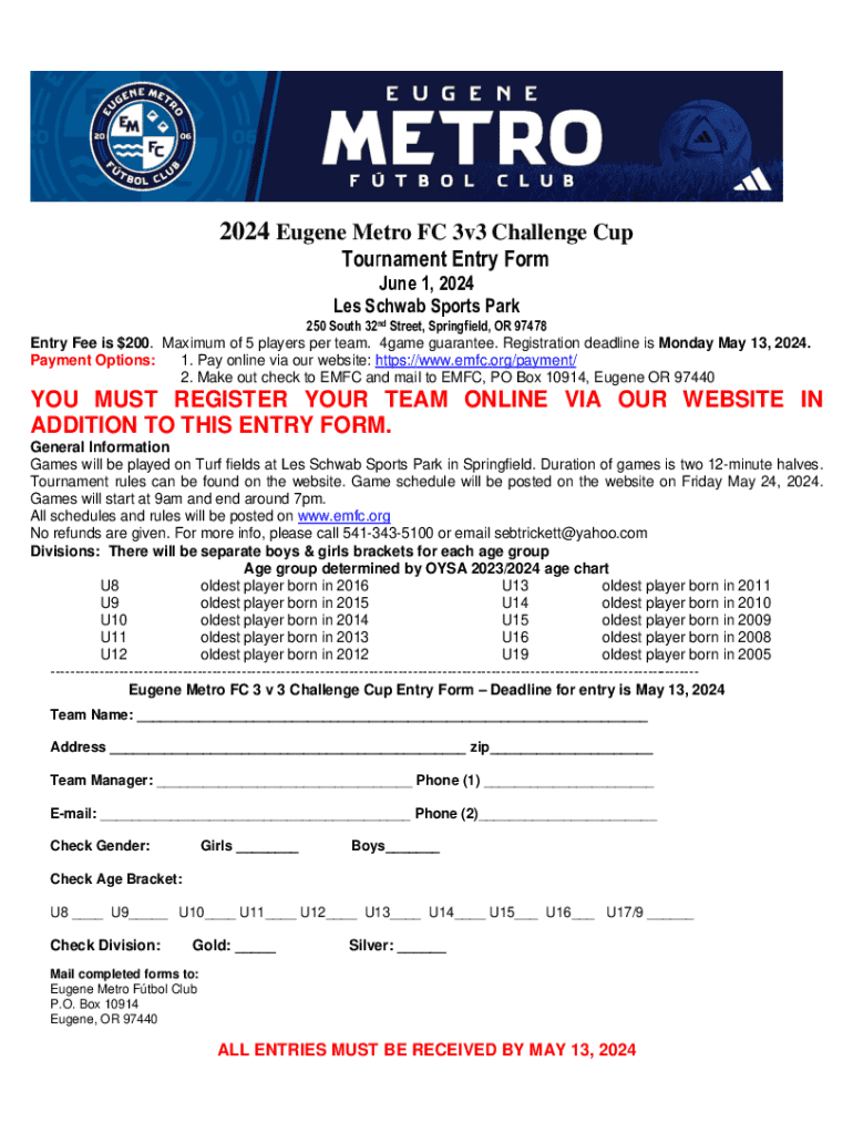 2024 Eugene Metro FC 3v3 Challenge Cup Tournament Entry FormJune 1, 2024 Les Schwab Sports Park250 South 32nd Street, Springfield, OR 97478Entry Fee is $200. Maximum of 5 players per team. 4game guarantee.