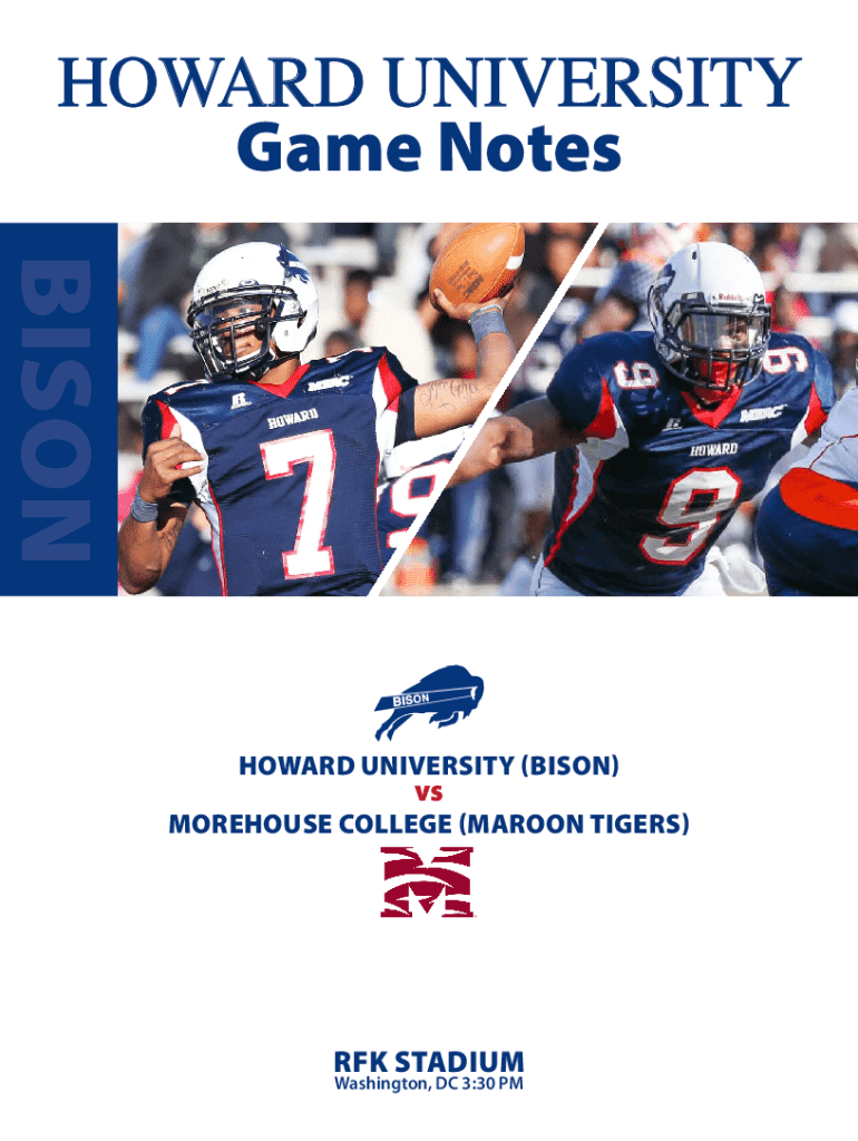 HOWARD UNIVERSITY Game NotesBISON Howard University (Bison)vsMorehouse College (Maroon Tigers)RFK stadium Washington, DC 3:30 PMGame Day THE GAME: This is the Third Annual AT&T Nations Football Classic,