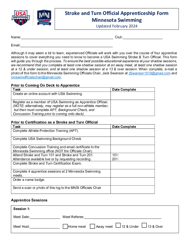Stroke and Turn Official Apprenticeship Form Minnesota Swimming Updated February 2024Name:___ Club:___ Email:___ Although it may seem a lot to learn, experienced Officials will work with you over