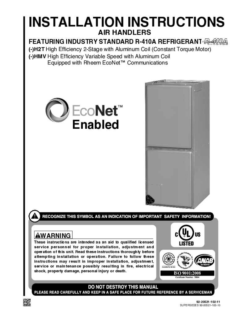 INSTALLATION INSTRUCTIONS AIR HANDLERSFEATURING INDUSTRY STANDARD R410A REFRIGERANT:()H2T High Efficiency 2Stage with Aluminum Coil (Constant Torque Motor) ()HMV High Efficiency Variable Speed with