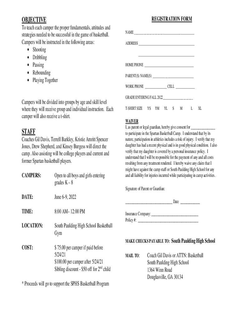 This document serves as a registration form for the Spartan Basketball Camp, designed to teach fundamental basketball skills to campers entering grades K-8. The camp focuses on essential skills such as shooting, dribbling, passing, and teamwork, and includes individual instruction, a t-shirt for participants, and waivers regarding safety and liability.