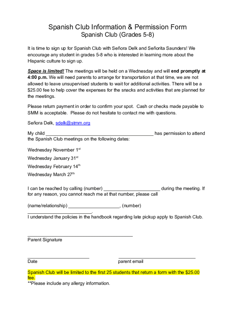 Get the free Spanish Club Information & Permission Form