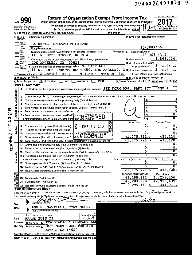 This document is the Form 990 for LA Kretz Innovation Campus, detailing the organization\'s financial activity for the tax year 2017. It includes information on income, expenses, governance, and compliance with IRS regulations for tax-exempt organizations under section 501(c)(3). The form outlines the organization\'s mission, program service accomplishments, contributions, and financial statements. It is used to report the operations of an organization exempt from Federal income tax.