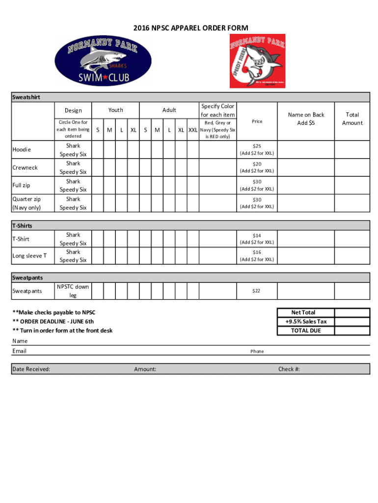 This document is an order form for various apparel items including sweatshirts, hoodies, t-shirts, and sweatpants for the NPSC. It provides details on sizes, colors, prices, and options for personalization, as well as ordering instructions and deadlines.