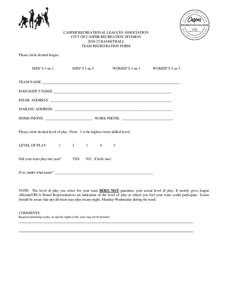 This form is used for registering basketball teams for the 2024-25 season within the Casper Recreational Leagues Association. It includes options for different leagues and levels of play for men and women, along with important deadlines, registration fees, and league rules.