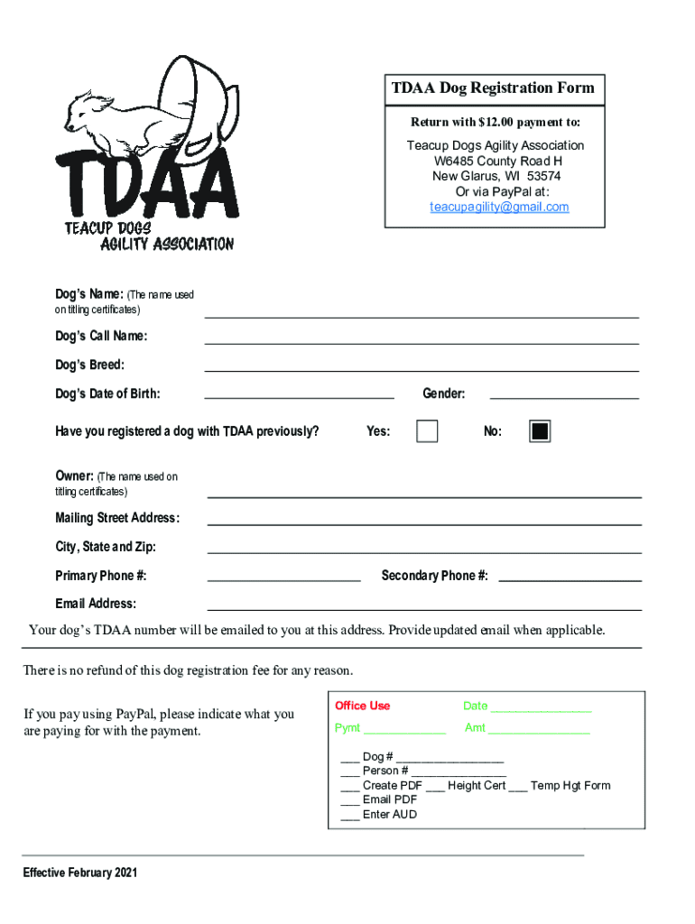 To fill out teacup dog agility trial registration, participants need to provide details such as the dog's name, breed, age, handler's information, and any registration fees, usually through an official form or online portal.