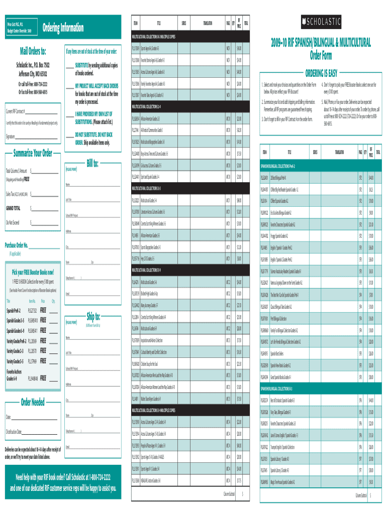 Price List: PLG, PLL Budget Center Override: 3169Ordering InformationMail Orders to:Current RIF Contract # I certify that this order is for use by a Reading is Fundamental project only.Signature:Summarize