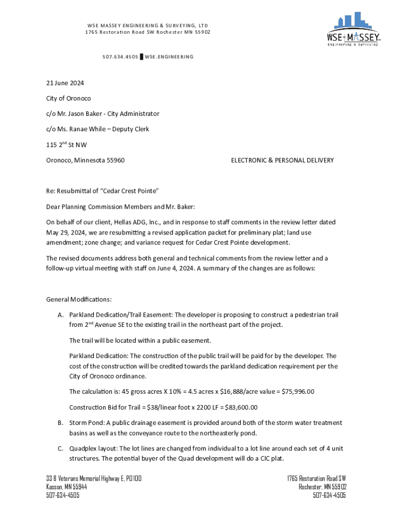 W S E MA S S E Y E NGI NE E RI NG & S U RV E Y I N G, L T D 1 7 6 5 R e s to ra t i on R o a d S W R oc h es t e r MN 5 5 9 0 25 0 7 . 6 3 4 . 4 5 0 5 | W S E . E NG I NE E R I NG21 June 2024 City