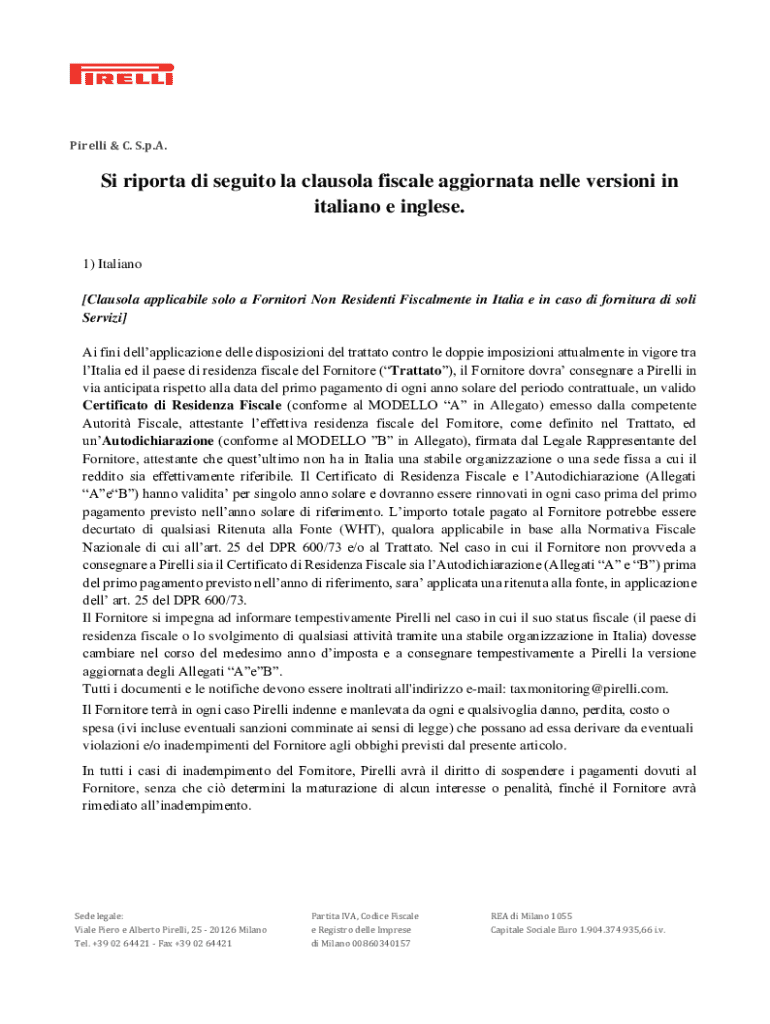 Pirelli & C. S.p.A.Si riporta di seguito la clausola fiscale aggiornata nelle versioni in italiano e inglese. 1) Italiano [Clausola applicabile solo a Fornitori Non Residenti Fiscalmente in Italia