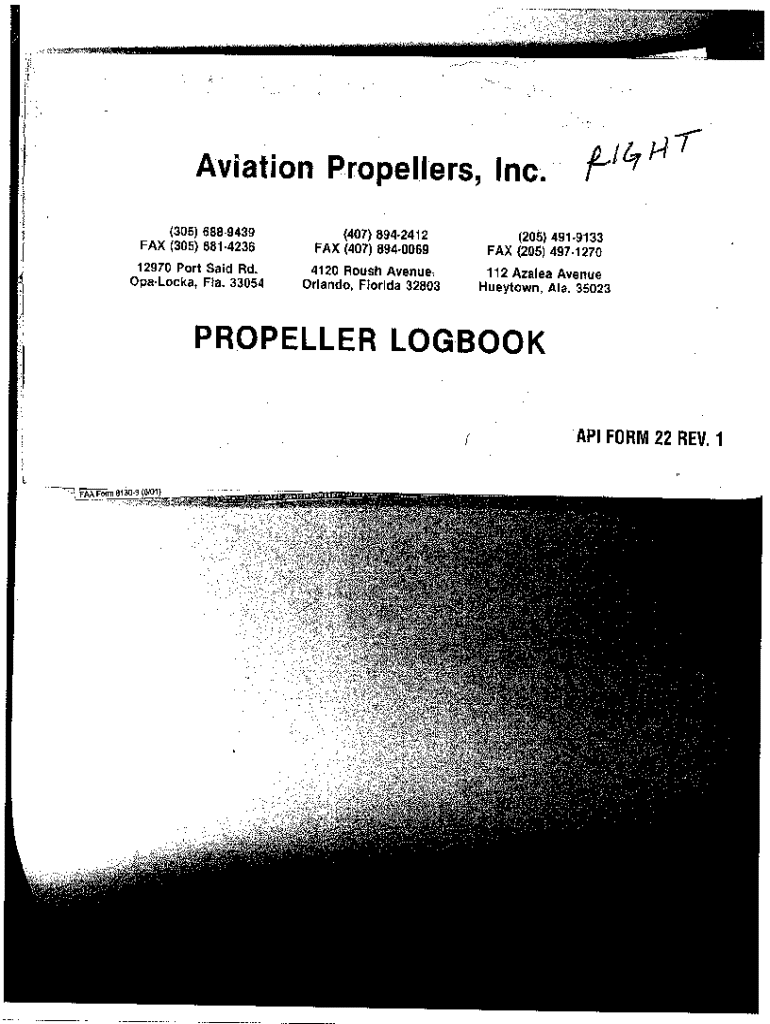 This document serves as a maintenance and service history logbook for propellers managed by Aviation Propellers, Inc. It includes details about inspections, repairs, and maintenance work performed on various propeller models, ensuring compliance with FAA regulations. The logbook captures specifics like owner information, propeller model and serial numbers, maintenance dates, and authorized signatures certifying the completed work.